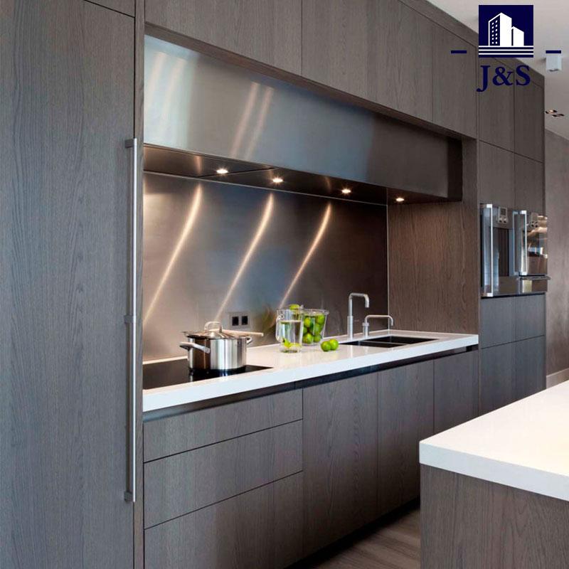 ☞Acryl keukendeuren maken gebruik van het pure melamine-dompelproces, de perstijd is één uur, het spiegeloppervlak is hoogglanzend vlak, hoge hardheid, geen vergeling en barsten.