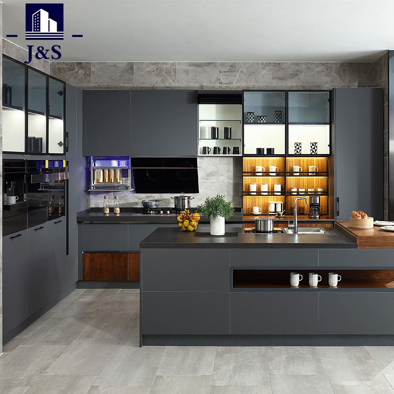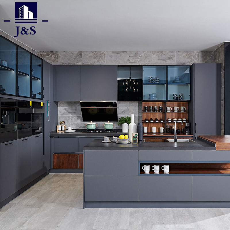 Wij leveren een grijze greeploze ingebouwde keukenkast. Met witte en lichtgrijze tinten is dit keukenontwerp eenvoudig en modern. De keukenindeling is L-vormig, waardoor er niet veel keukenruimte nodig is en er voldoende bewegingsruimte overblijft voor de gebruikers. De zwarte metalen planken, het zwarte aluminium frameglas en de grijze steenkleurige deuren voegen een gevoel van industriële stijl toe aan deze keuken. Open houten planken met eilandontwerp en het houten barblad vormen een mooie match en breken het traditionele eilandontwerpidee af.