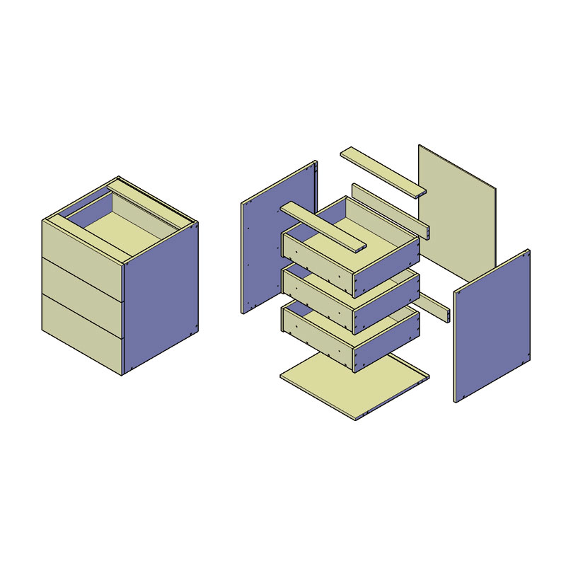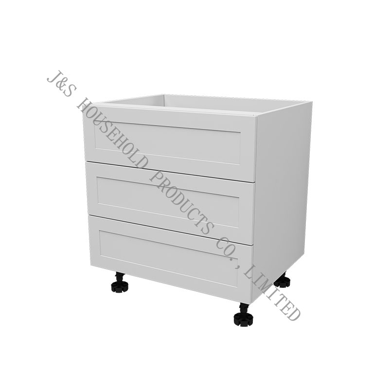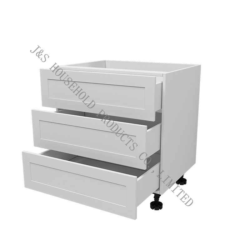 De flat-pack keukenkast met drie laden is een soort flat-pack-kast. Over Flat Pack-keukens. Een flatpack-keuken is een doe-het-zelf-keuken, waarbij je hem feitelijk zelf in elkaar zet uit alle componenten die de fabrikant je toestuurt. Elk onderdeel wordt nauwkeurig gesneden en geboord en je past de stukjes in elkaar als een legpuzzel. Als je eenmaal de flatpack-keuken hebt gekocht, heb je niets anders meer nodig, want alle kasten, accessoires, handgrepen, ladegeleiders, werkbladen enzovoort zijn inbegrepen. Als je hem eenmaal in elkaar hebt gezet, heb je een complete, functionerende keuken. Flatpack-keukens kunnen volgens uw exacte specificaties worden ontworpen en worden binnen 15 tot 30 dagen na ontvangst van de plannen vervaardigd en naar u verzonden.